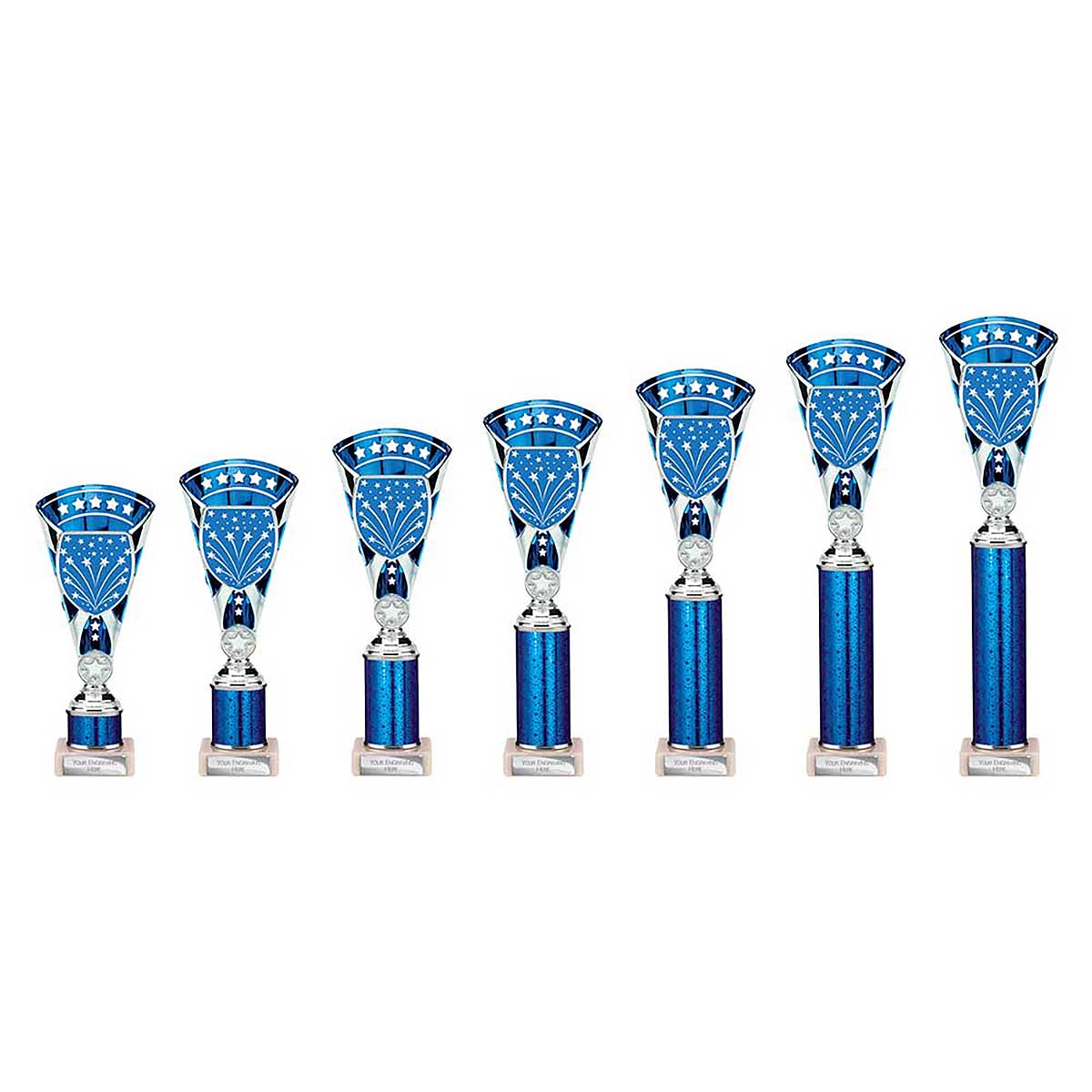 Blue Silver Cobra Cup Trophy 230mm Star design sticker on the front of the cup with sparkly column and stone base A custom sticker, engraving plate and club badge can be applied to the front