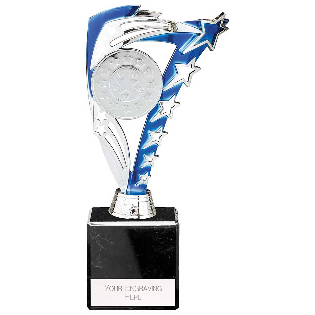 Blue and silver Frenzy Multisport Trophy 215mm highMoulded plastic design on a black marble baseEngraving plate and club badge can be applied to the front