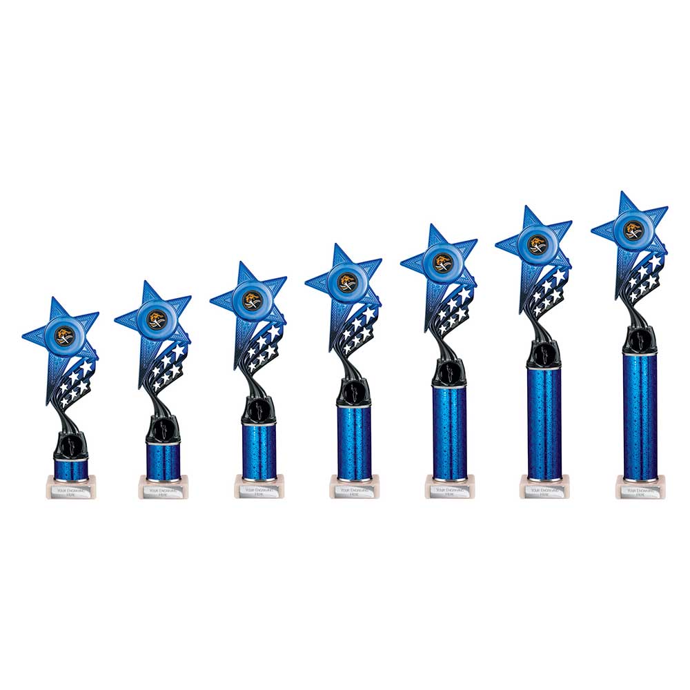 Blue Innov8 Multisport Trophy 325mm high Intricate plastic star design on a sparkly column and stone base Engraving plate and club badge can be applied to the front