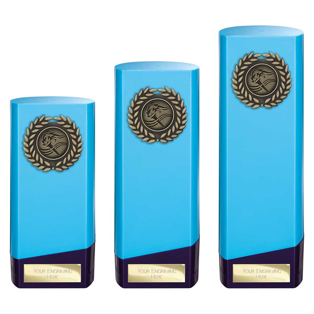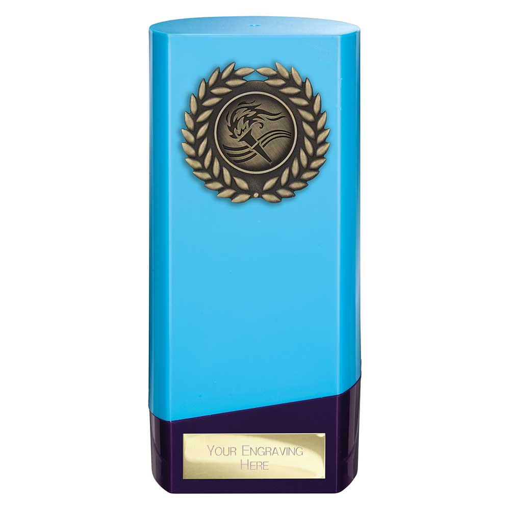 Blue Prime Multisport Trophy 160mm highFeatures blue and purple block with gold wreathEngraving plate and badge can be applied to front