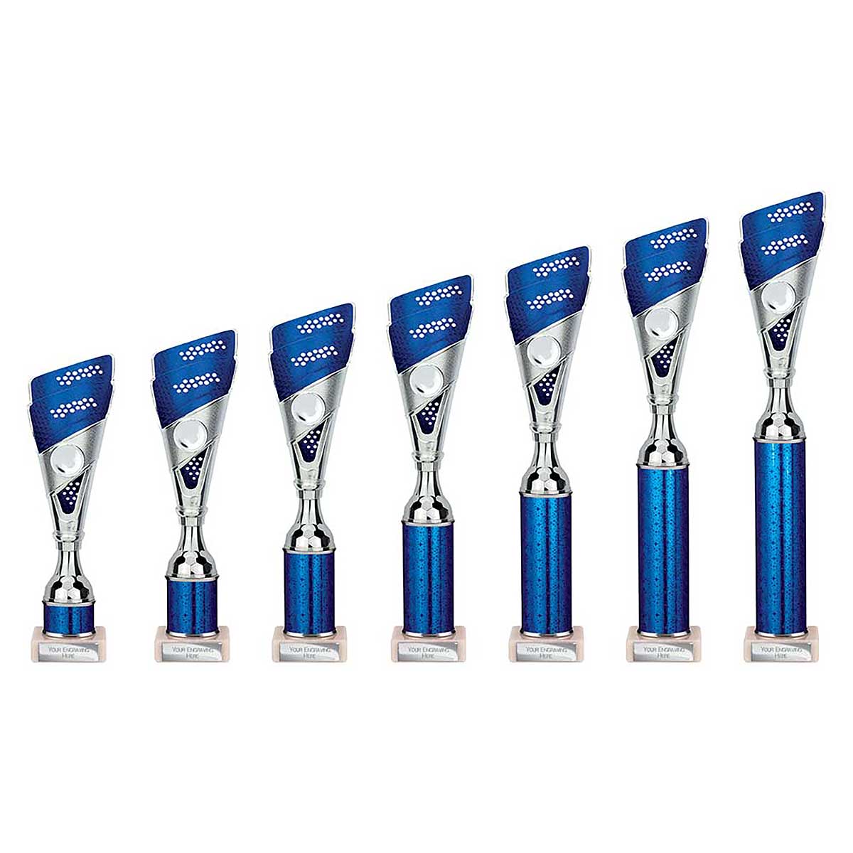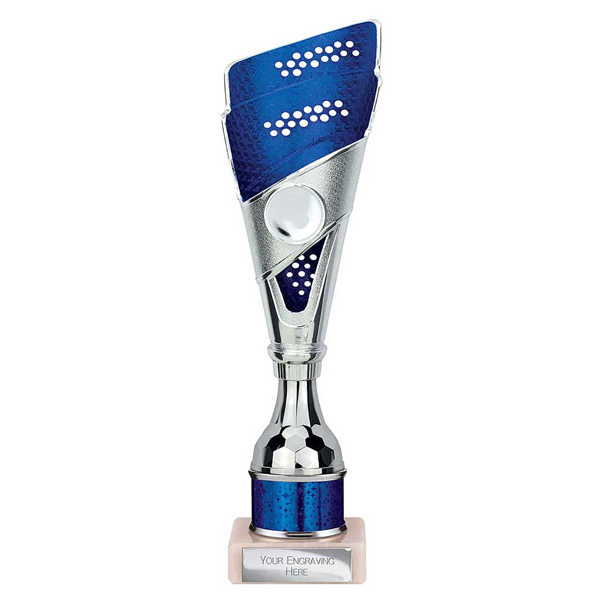 Blue and silver Predator multisport trophy 260mm high Detailed plastic cone design with glitter column & stone base Engraving plate and club badge can be applied to the front