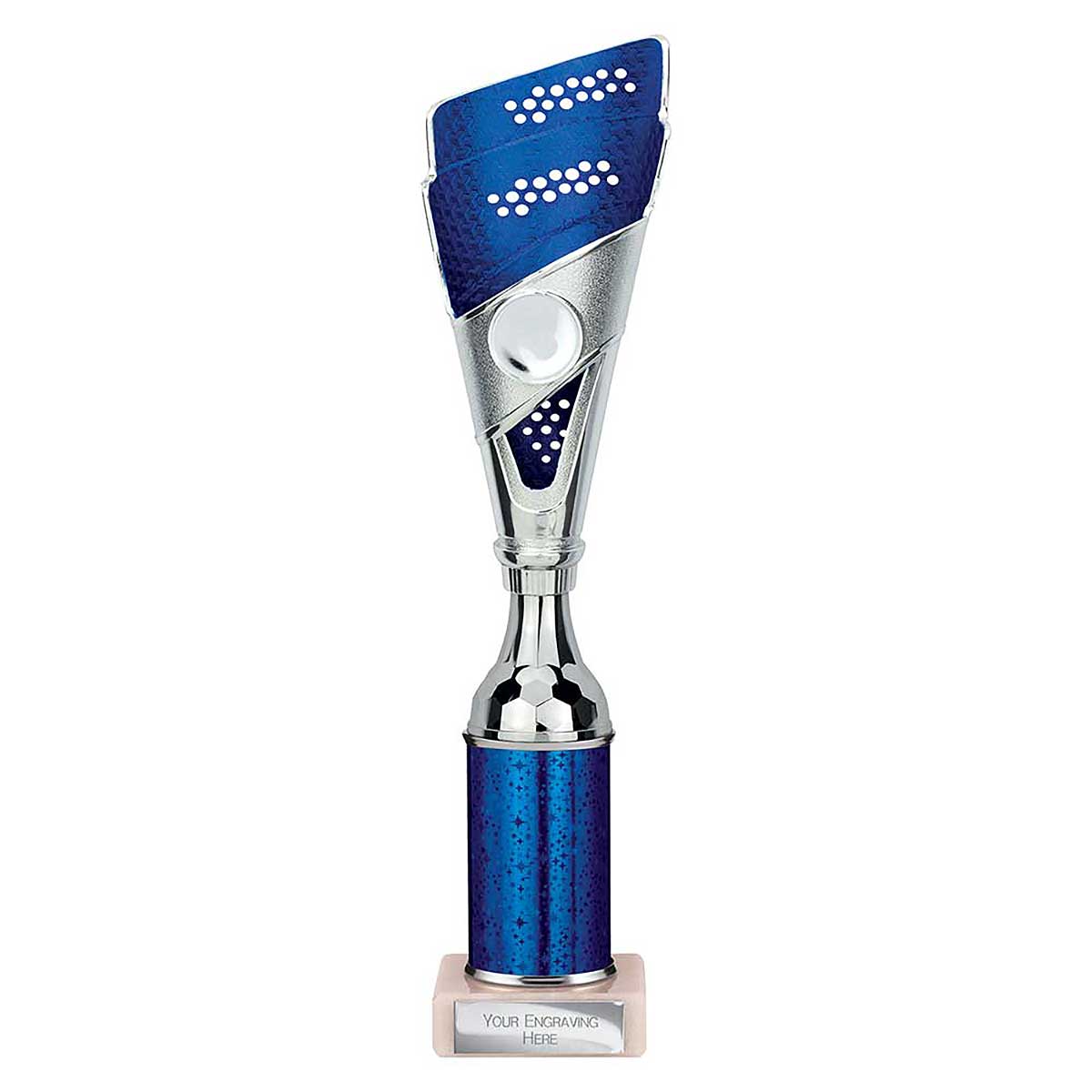 Blue and silver Predator multisport trophy 310mm high Detailed plastic cone design with glitter column & stone base Engraving plate and club badge can be applied to the front