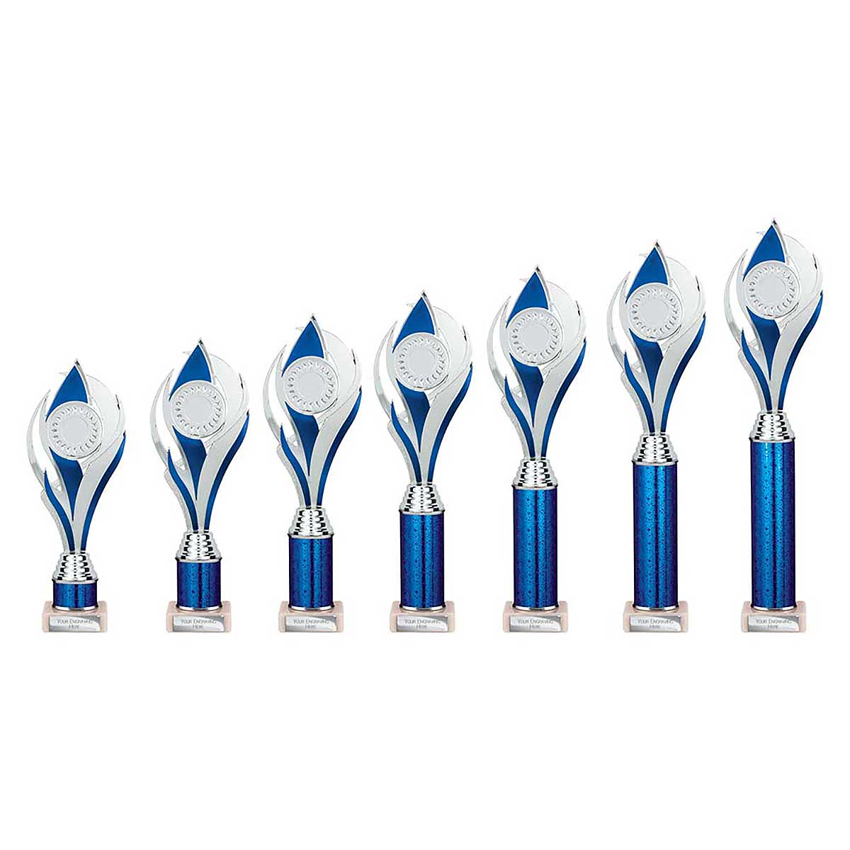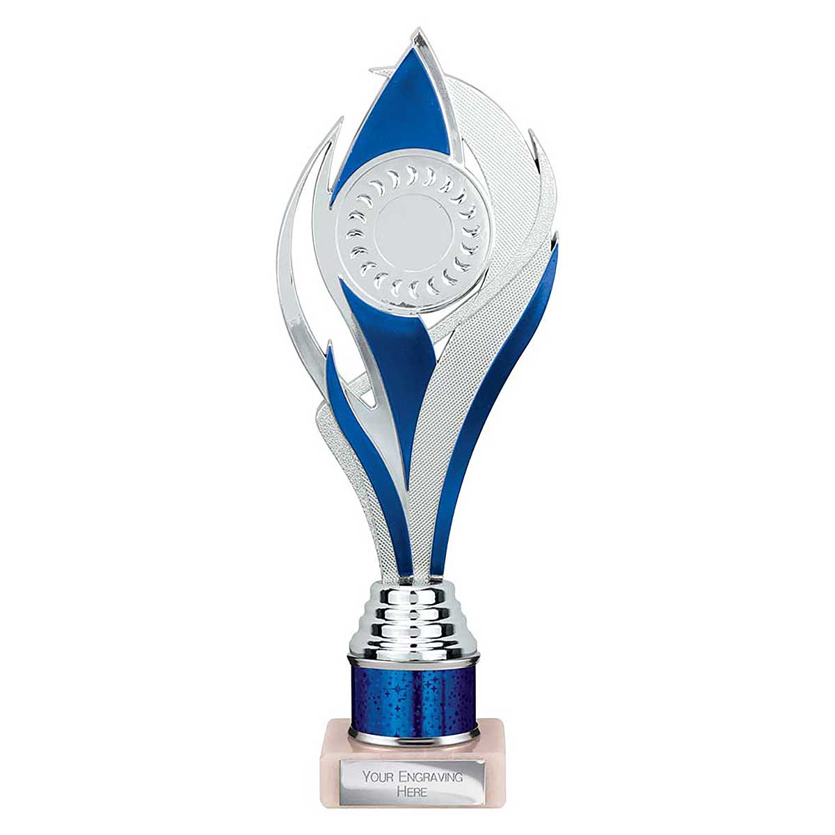 Blue and silver Super Volcano Trophy 260mm high Moulded plastic design on a superstar glitter column and stone base Engraving plate and club badge can be applied to the front
