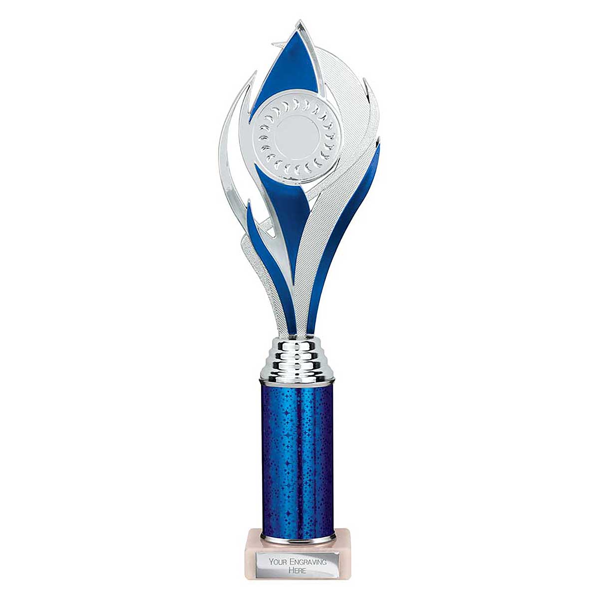 Blue & Silver Super Volcano Trophy 335mm high Moulded plastic design on a superstar glitter column and stone base Engraving plate and club badge can be applied to the front