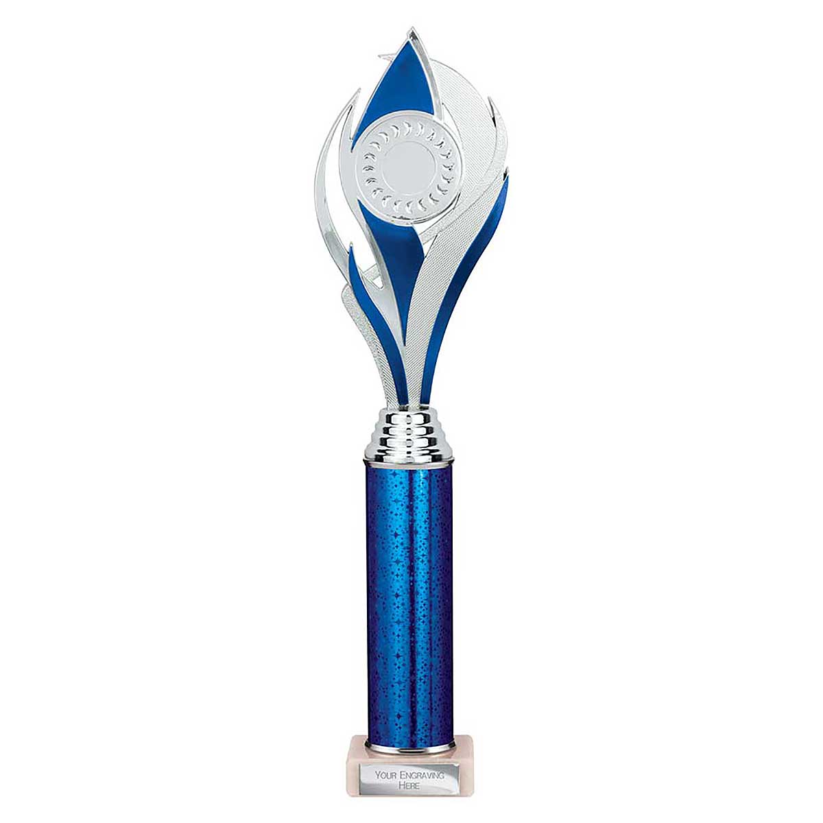 Blue & Silver Super Volcano Trophy 385mm high Moulded plastic design on a superstar glitter column and stone base Engraving plate and club badge can be applied to the front