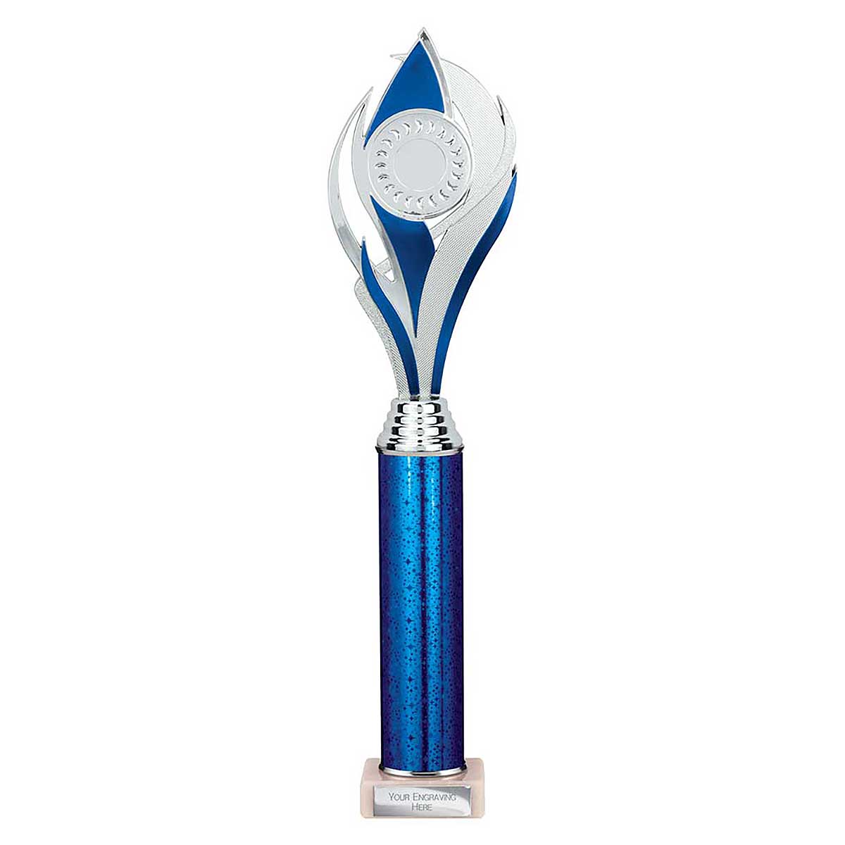 Blue & Silver Super Volcano Trophy 410mm high Moulded plastic design on a superstar glitter column and stone base Engraving plate and club badge can be applied to the front