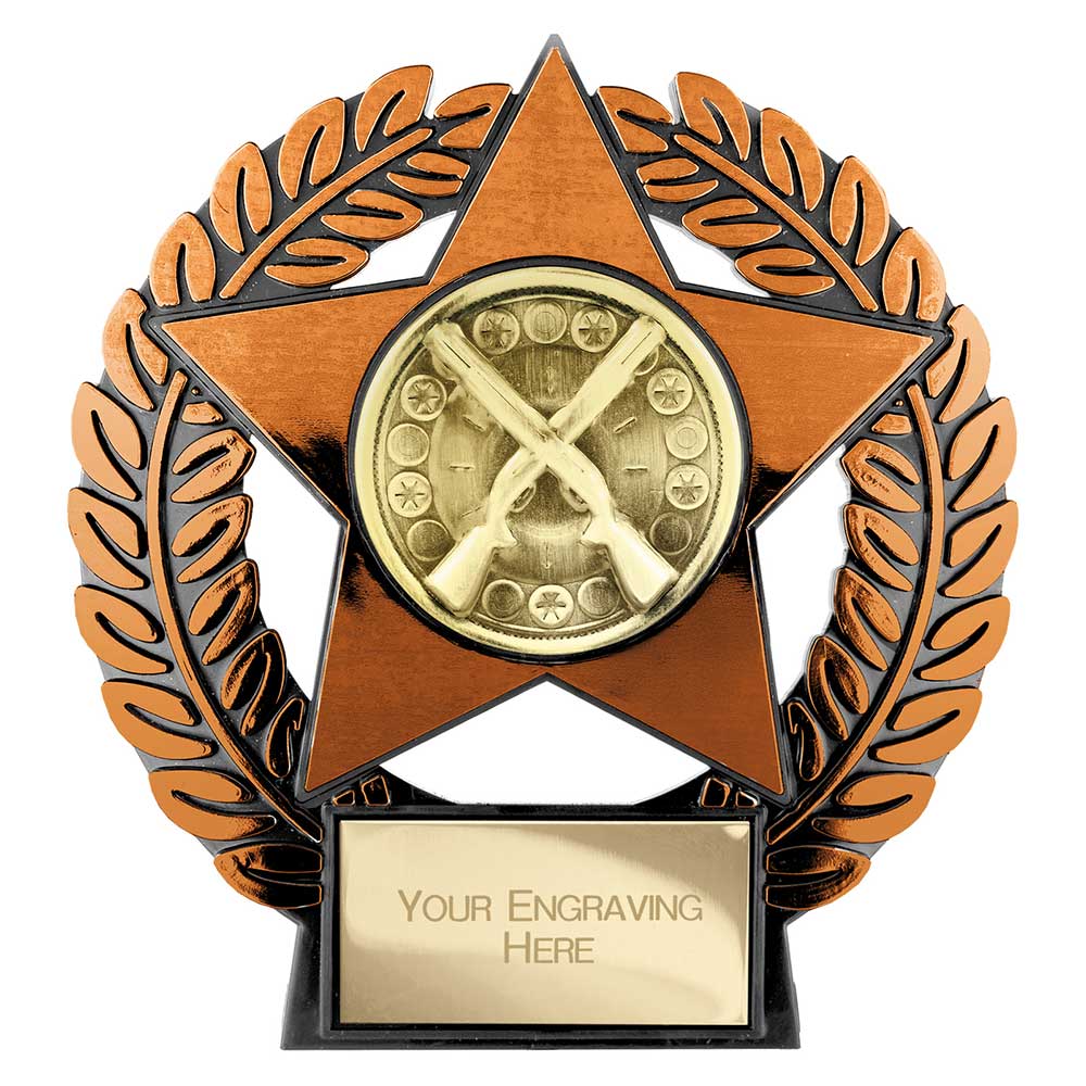 Emperor Star Bronze Clay Pigeon Plaque 120mm highFeatures shooting centre set within bronze star on laurel standEngraving plate can be applied to front