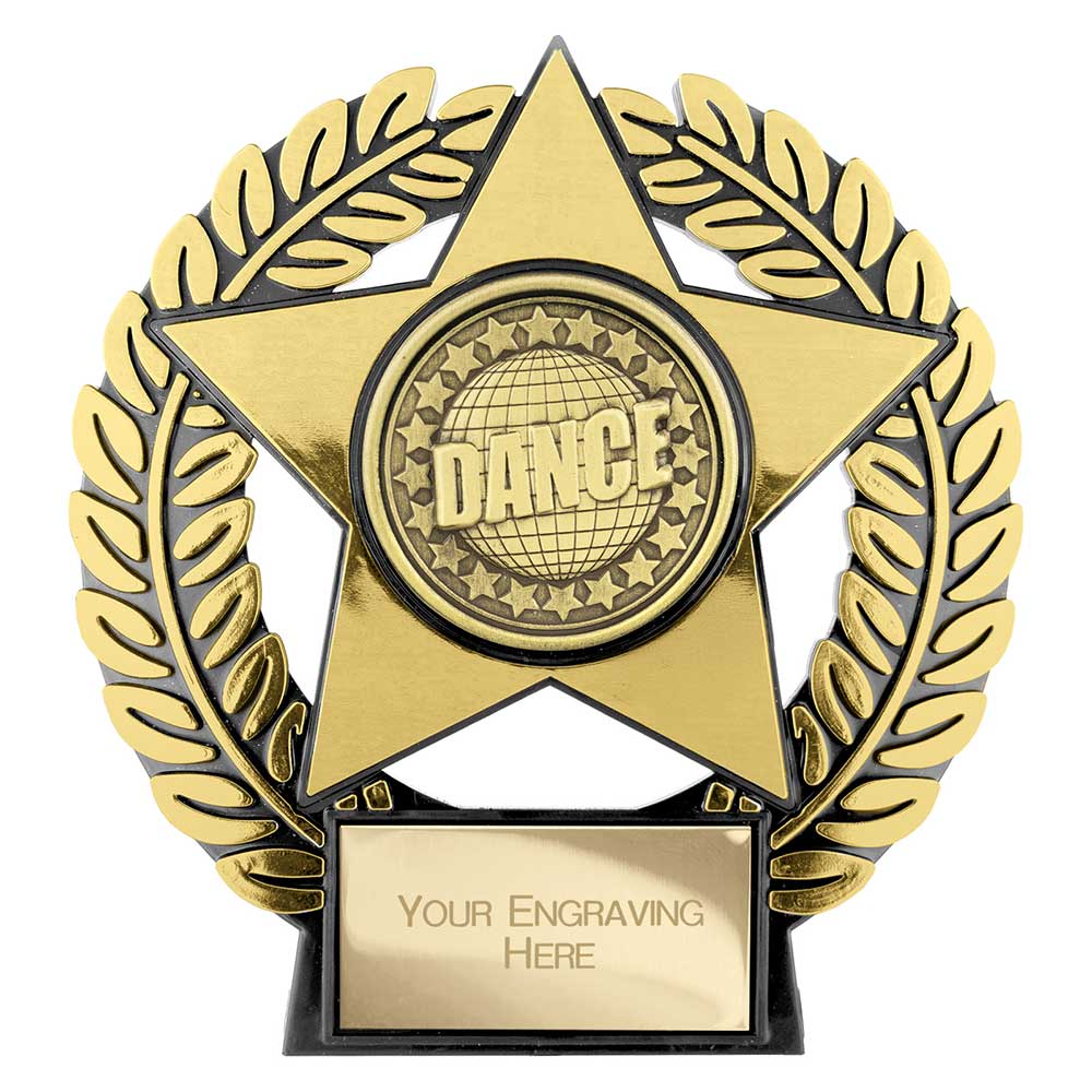 Emperor Star Dance Trophy 120mm high Features gold and black star with a surrounding laurel Engraving plate can be applied to the front