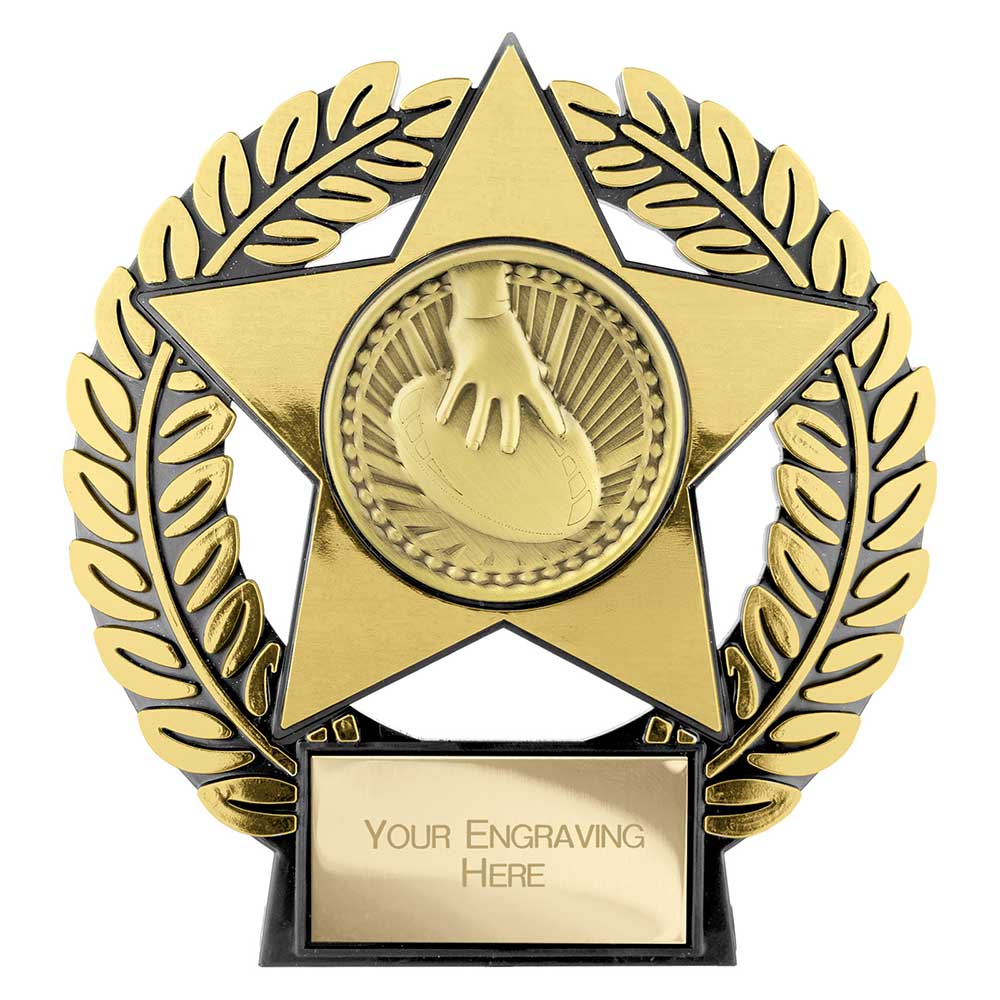 Emperor Star Gold Rugby Plaque 120mm highFeatures rugby centre set within gold star on laurel standEngraving plate can be applied to front