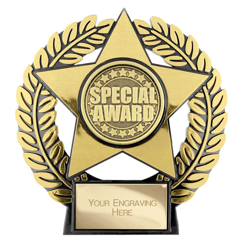Emperor Star Gold Special Award Plaque 120mm highFeatures special award centre set within gold star on laurel standEngraving plate can be applied to front