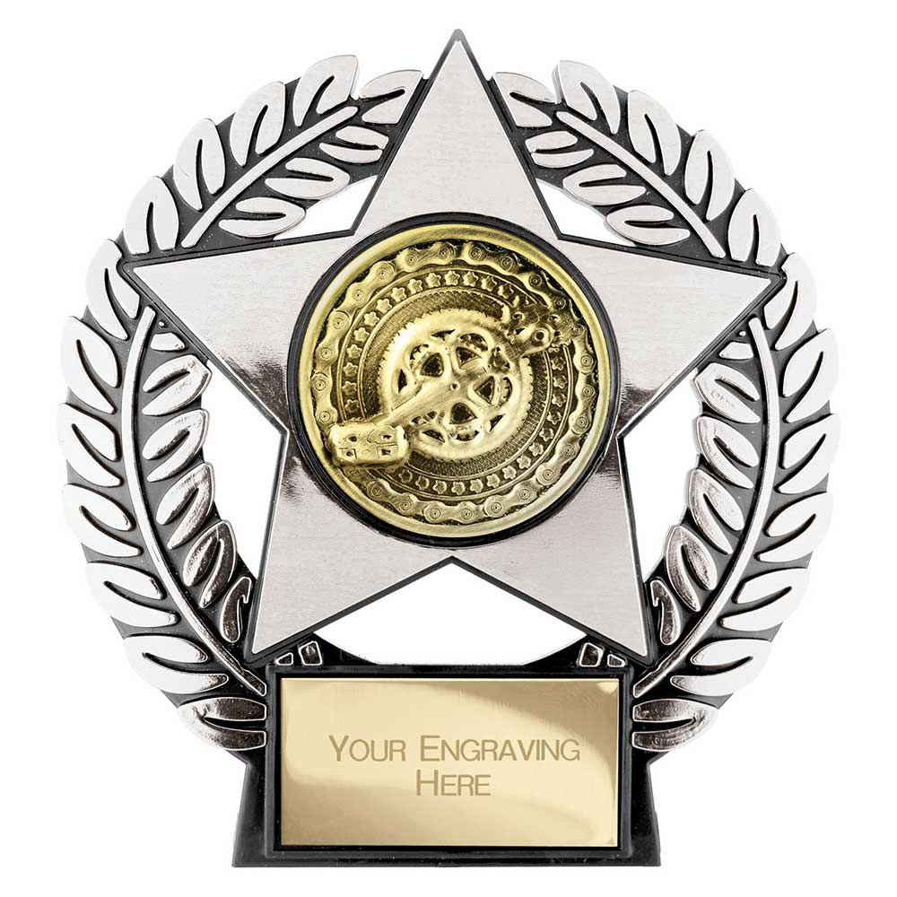 Emperor Star Silver Cycling Plaque 120mm highFeatures cycling centre set within silver star on laurel standEngraving plate can be applied to front