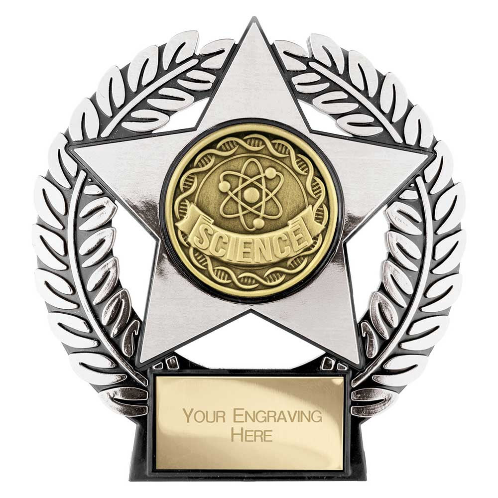 Emperor Star Silver Science Plaque 120mm highFeatures science centre set within silver star on laurel standEngraving plate can be applied to front