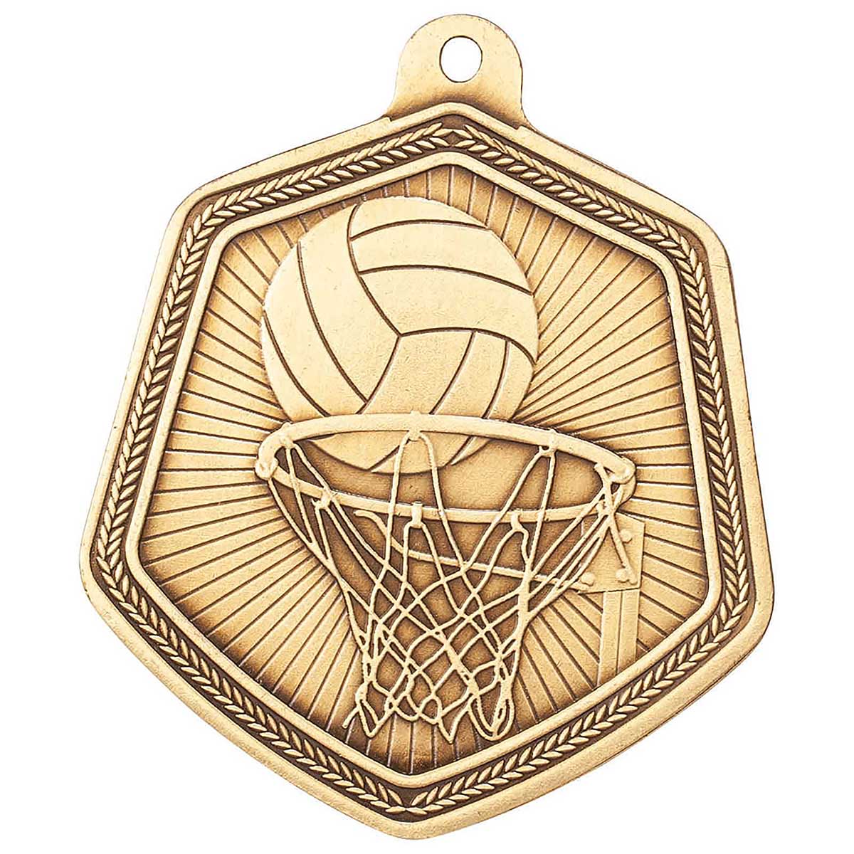 Falcon Netball Medal Gold 65mm high 55mm at widest pointMedal loop at topSee our range of 25mm and 10mm ribbons