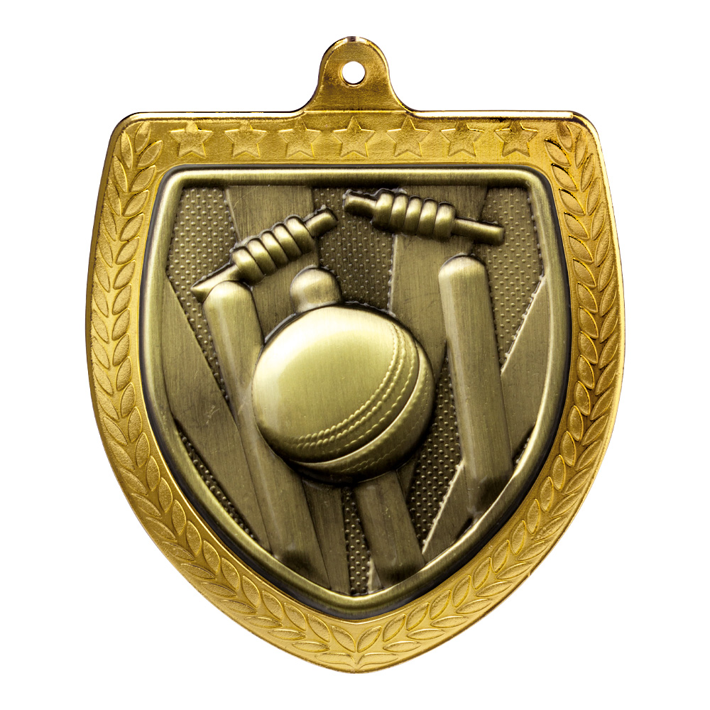 Gold Cobra Shield Cricket Medal 70mm at widest diameter 75mm highFeatures gold fascia to frontView our ribbons page for your colour options