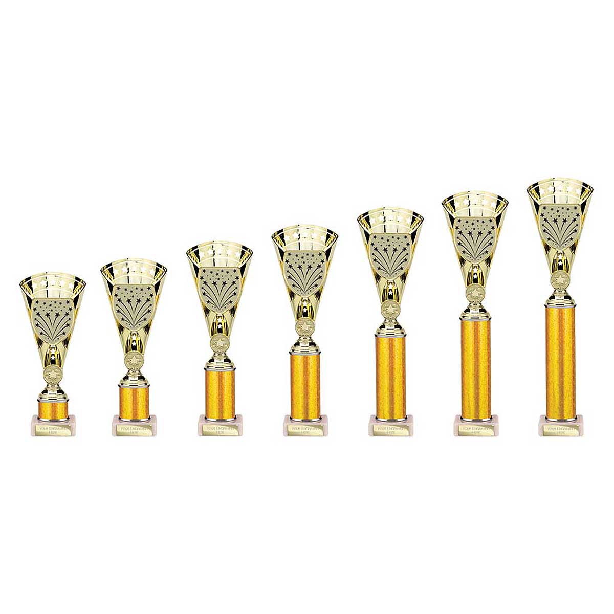 Gold Silver Cobra Cup Trophy 280mm Star design sticker on the front of the cup with sparkly column and stone base A custom sticker, engraving plate and club badge can be applied to the front