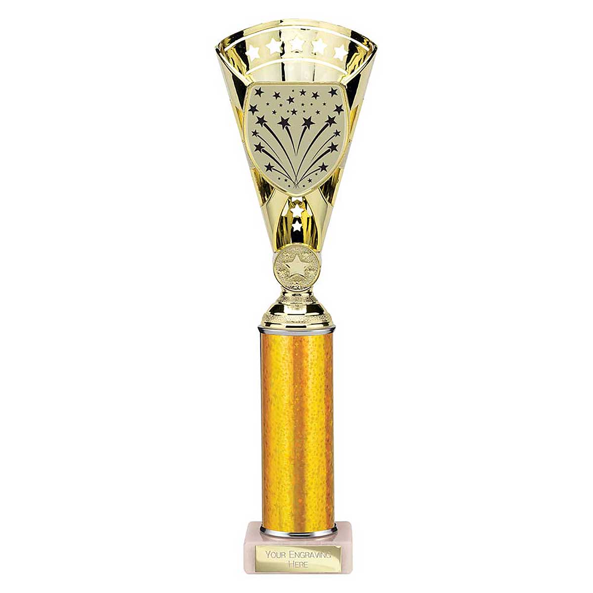 Gold Silver Cobra Cup Trophy 330mm Star design sticker on the front of the cup with sparkly column and stone base A custom sticker, engraving plate and club badge can be applied to the front