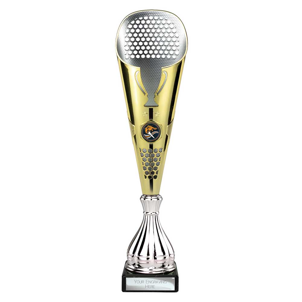 Gold Eclectic Cup Trophy 345mm high Gold plastic design on a silver riser and black stone base Engraving plate and club badge can be applied to the front