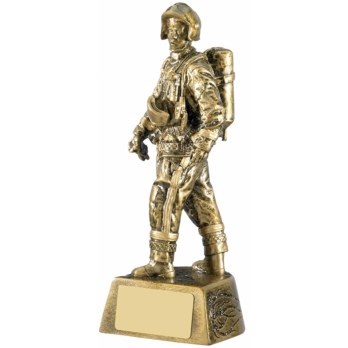 Gold Firefighter Award 195mmFeatures male firefighter in gold on a co-ordinating baseEngraving plare can be applied to front