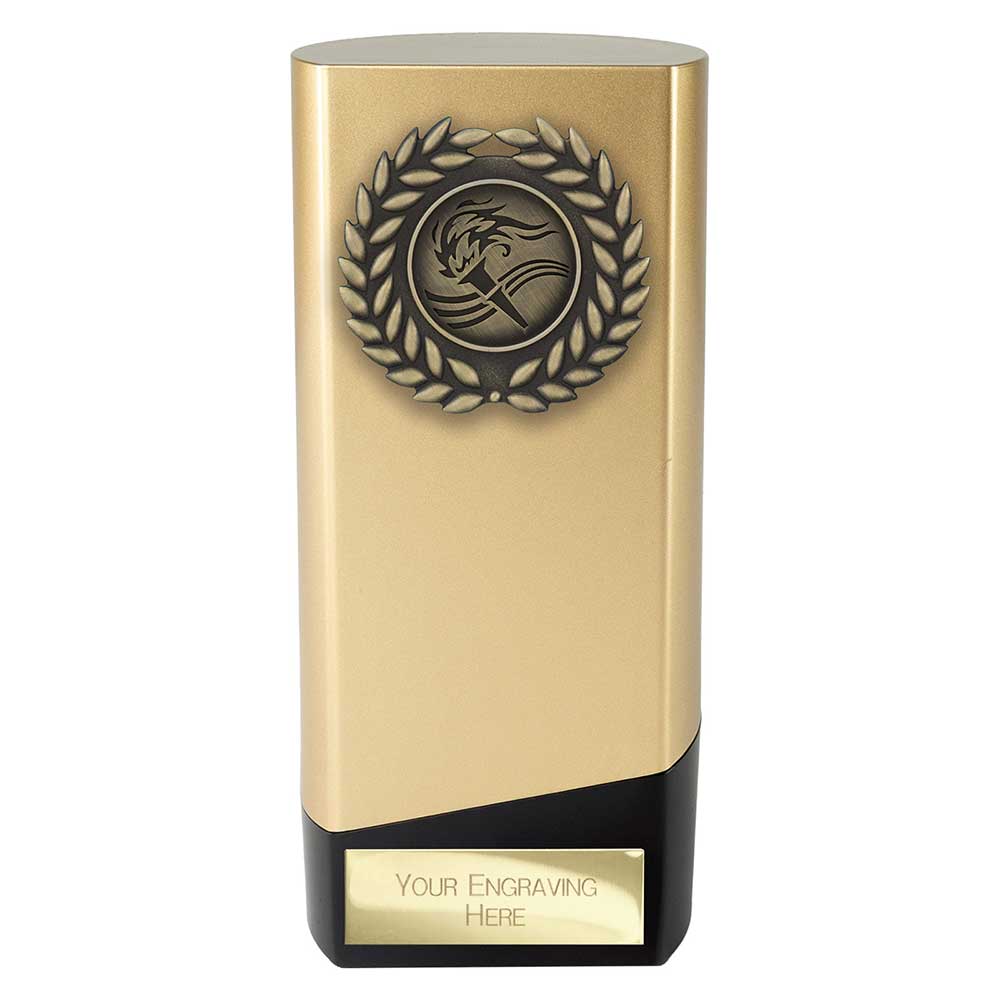Gold Prime Multisport Trophy 160mm highFeatures gold and black block with gold wreathEngraving plate and badge can be applied to front