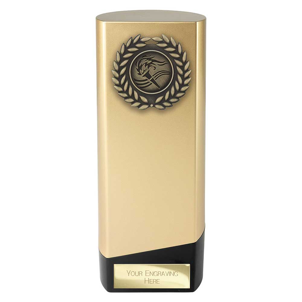 Gold Prime Multisport Trophy 190mm highFeatures gold and black block with gold wreathEngraving plate and badge can be applied to front