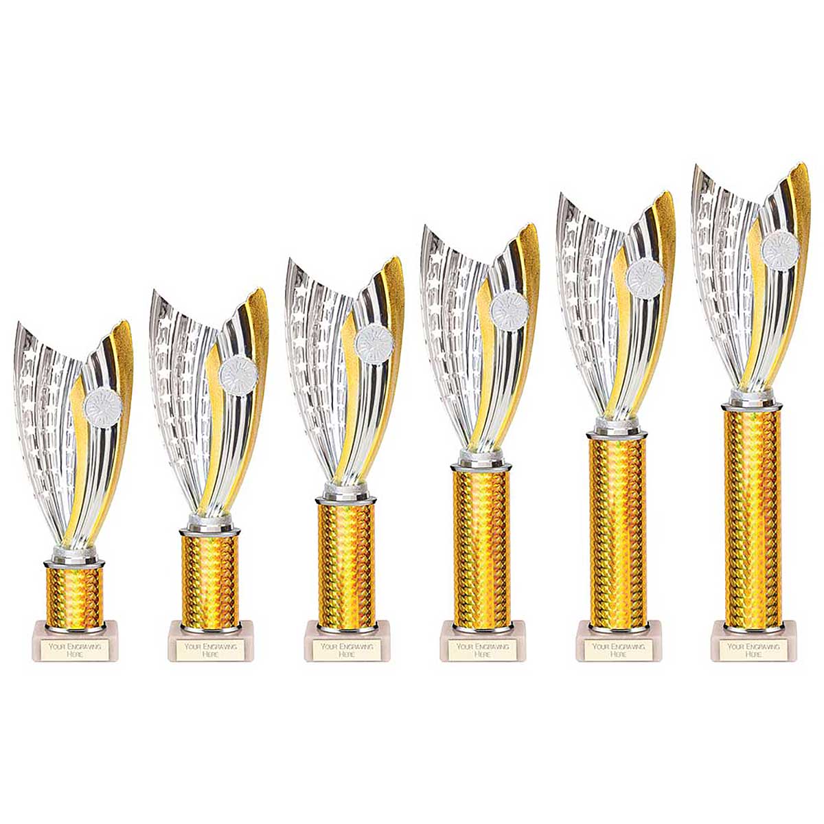 Gold and silver Glamstar trophy 390mm Plastic silver star and coloured curve on a sparkly column and stone baseEngraving plate and club badge can be applied to the front