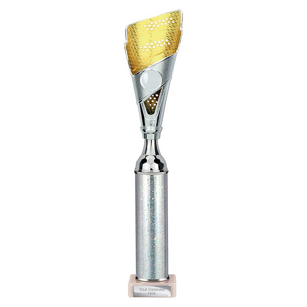 Gold and silver Predator multisport trophy 385mm high Detailed plastic cone design with glitter column & stone base Engraving plate and club badge can be applied to the front