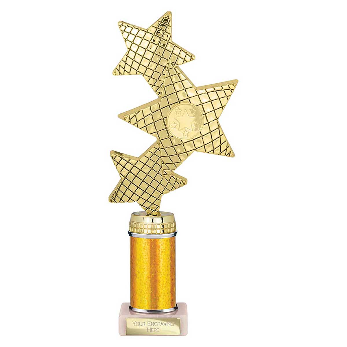 Gold Trinity Super Star Trophy 290mm highMoulded plastic design on a superstar sparkly column and stone baseEngraving plate and club badge can be applied to the front