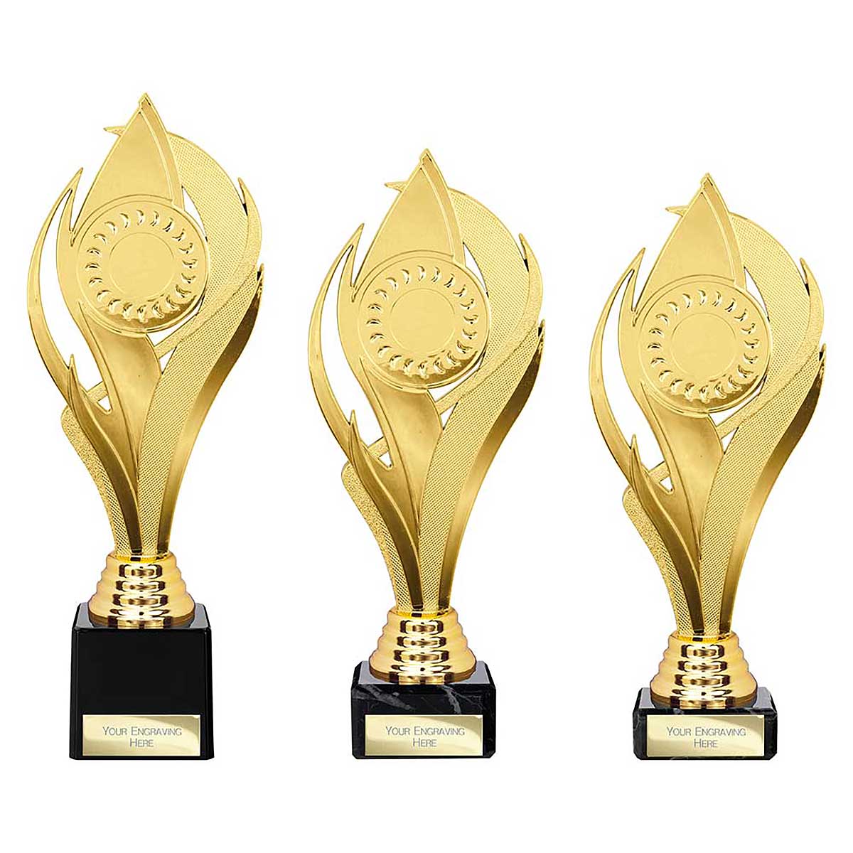 Gold Volcano Trophy 260mm highGold plastic design on a black marble baseEngraving plate and club badge can be applied to the front