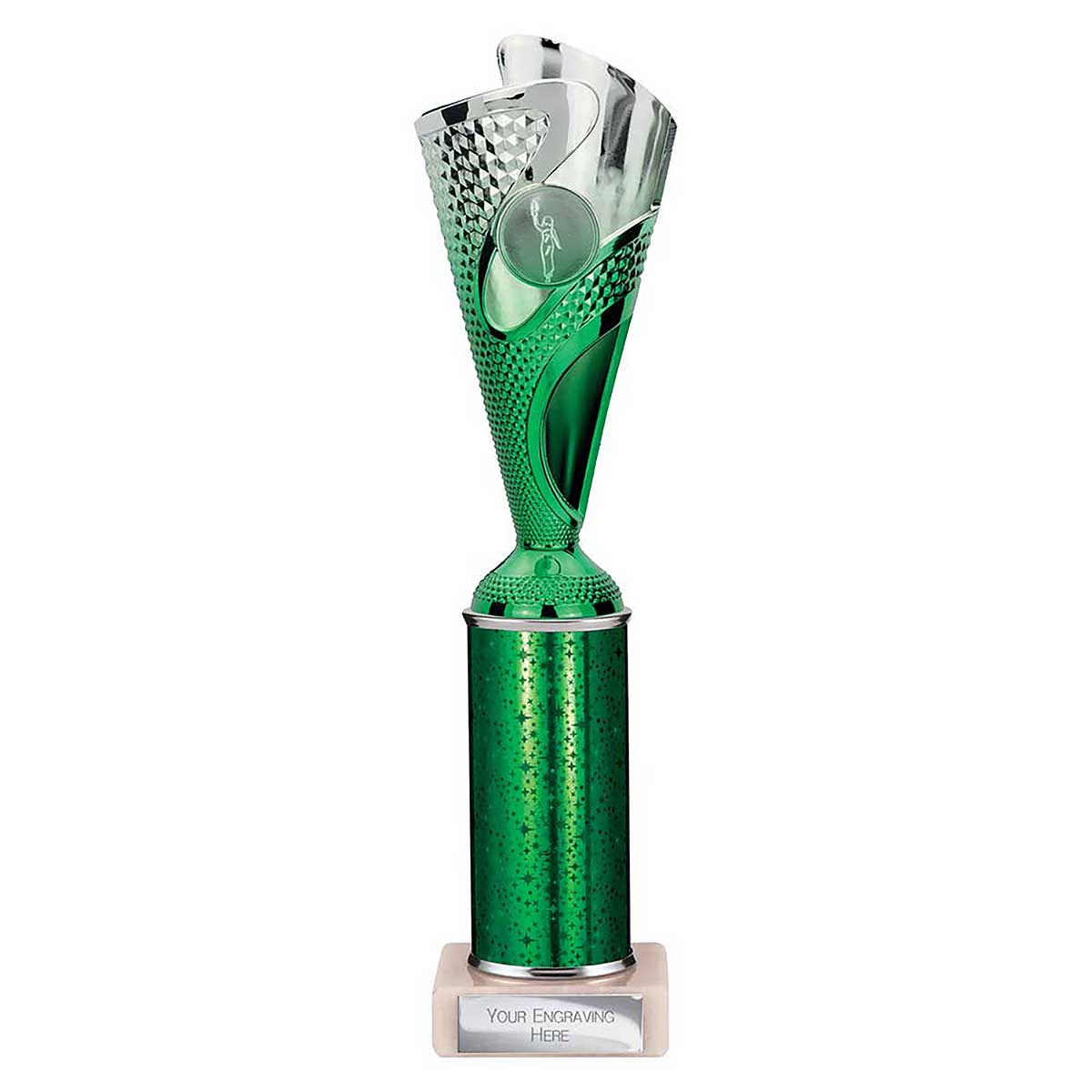 Green Silver Rodeo Multsport Award 290mm high Modern design plastic flute on a sparkly column and stone base Engraving plate and club badge can be applied to the front