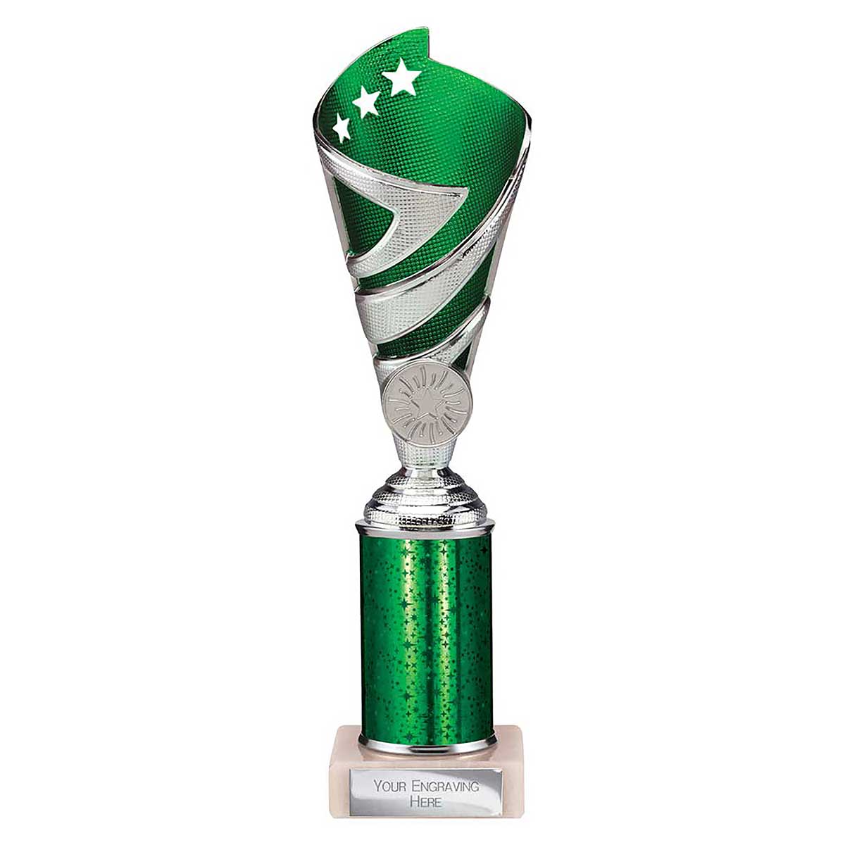 Green and silver Super Hurricane Multisport Trophy 250mm high Textured plastic design on a glitter column and stone base Engraving plate and club badge can be applied to the front