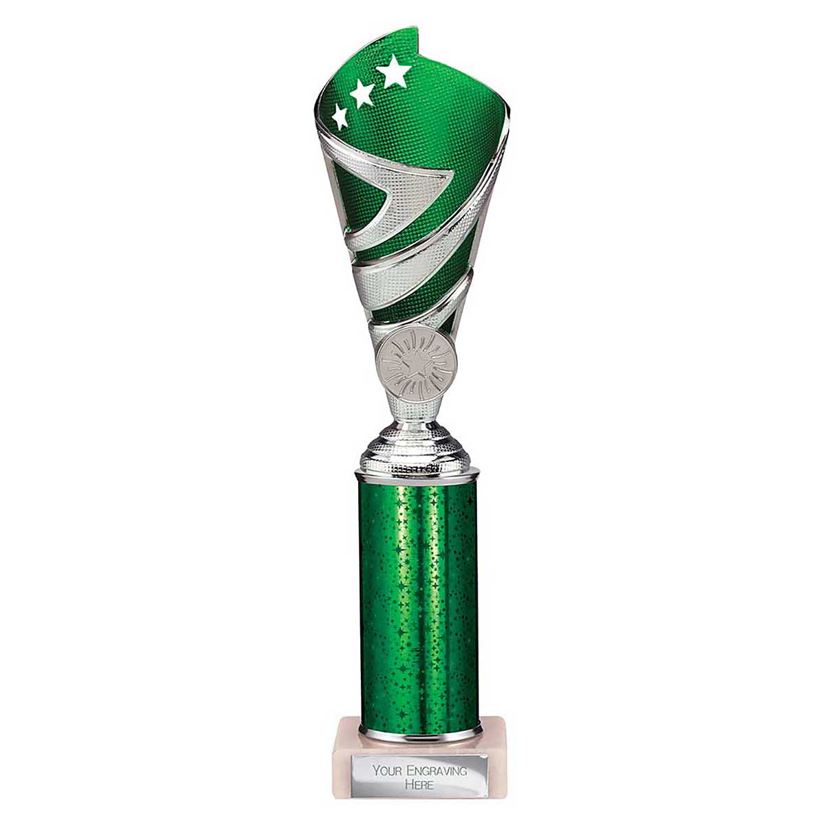 Green and silver Super Hurricane Multisport Trophy 275mm high Textured plastic design on a glitter column and stone base Engraving plate and club badge can be applied to the front