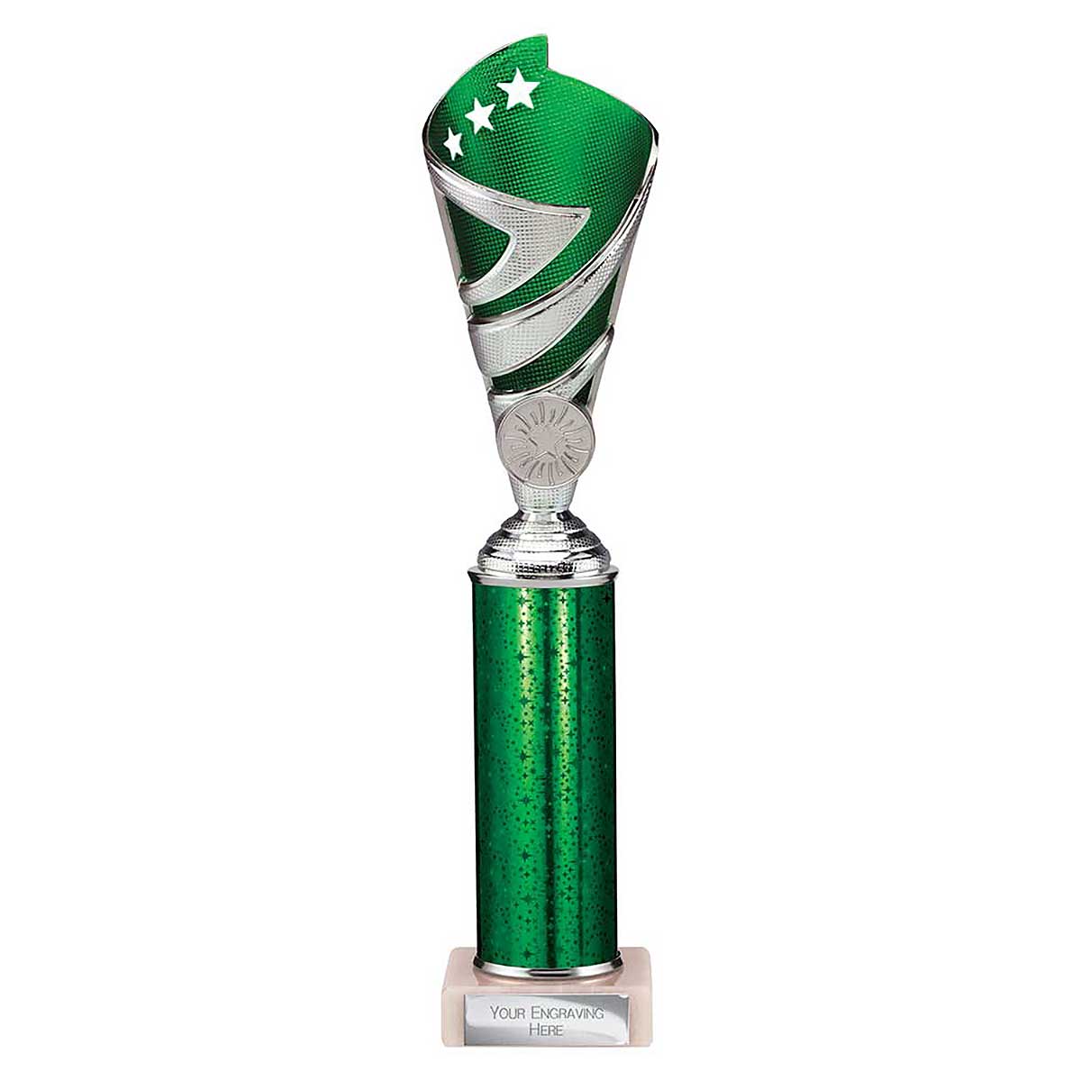 Green and silver Super Hurricane Multisport Trophy 300mm high Textured plastic design on a glitter column and stone base Engraving plate and club badge can be applied to the front