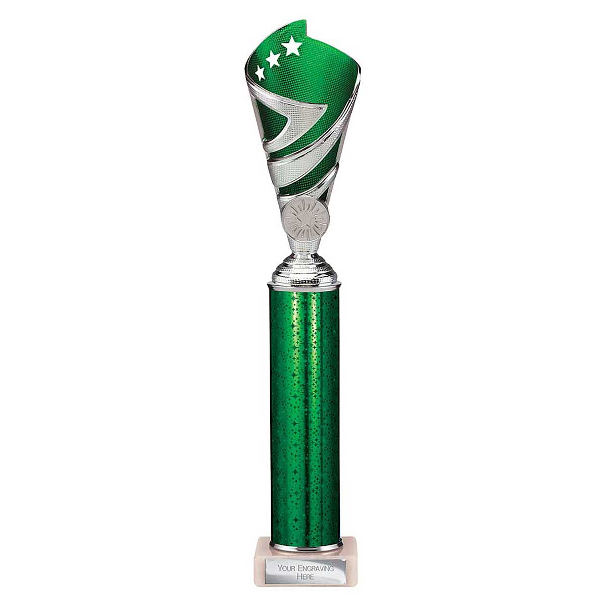 Green Super Hurricane Multisport Trophy 350mm high Textured plastic design on a glitter column and stone base Engraving plate and club badge can be applied to the front