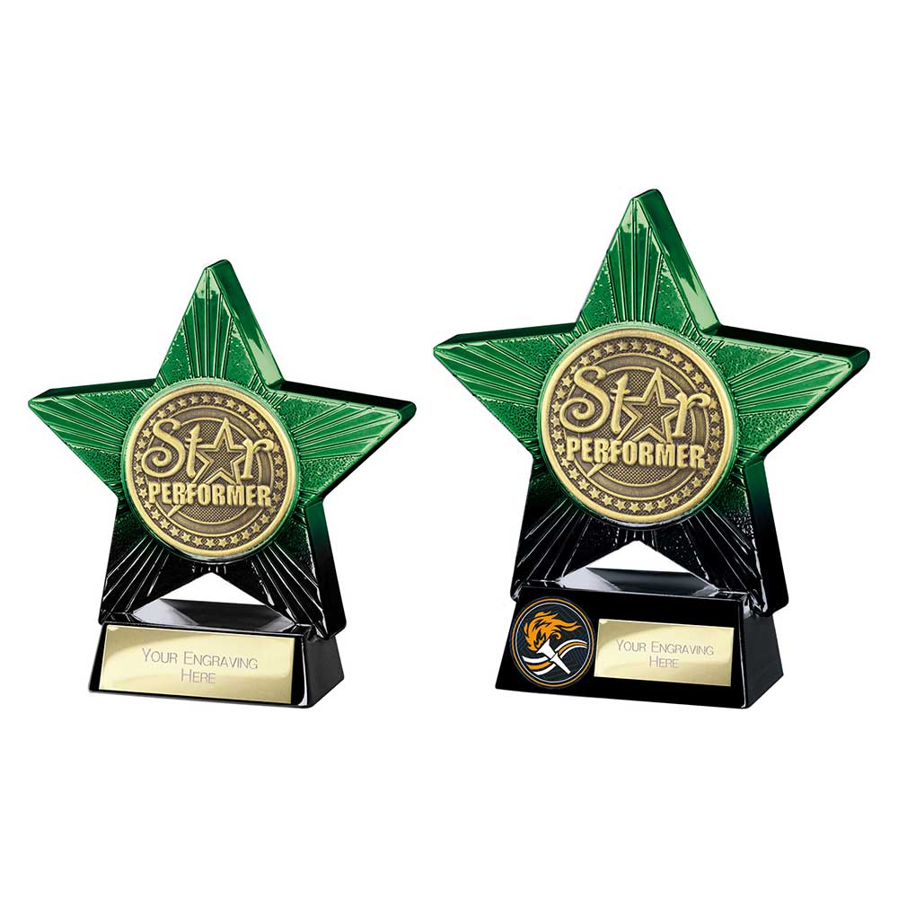 Green Superstar Star Performer Award 140mm highFeatures star performer centre set within green and black star on a wedged gold standEngraving plate and badge can be applied to front