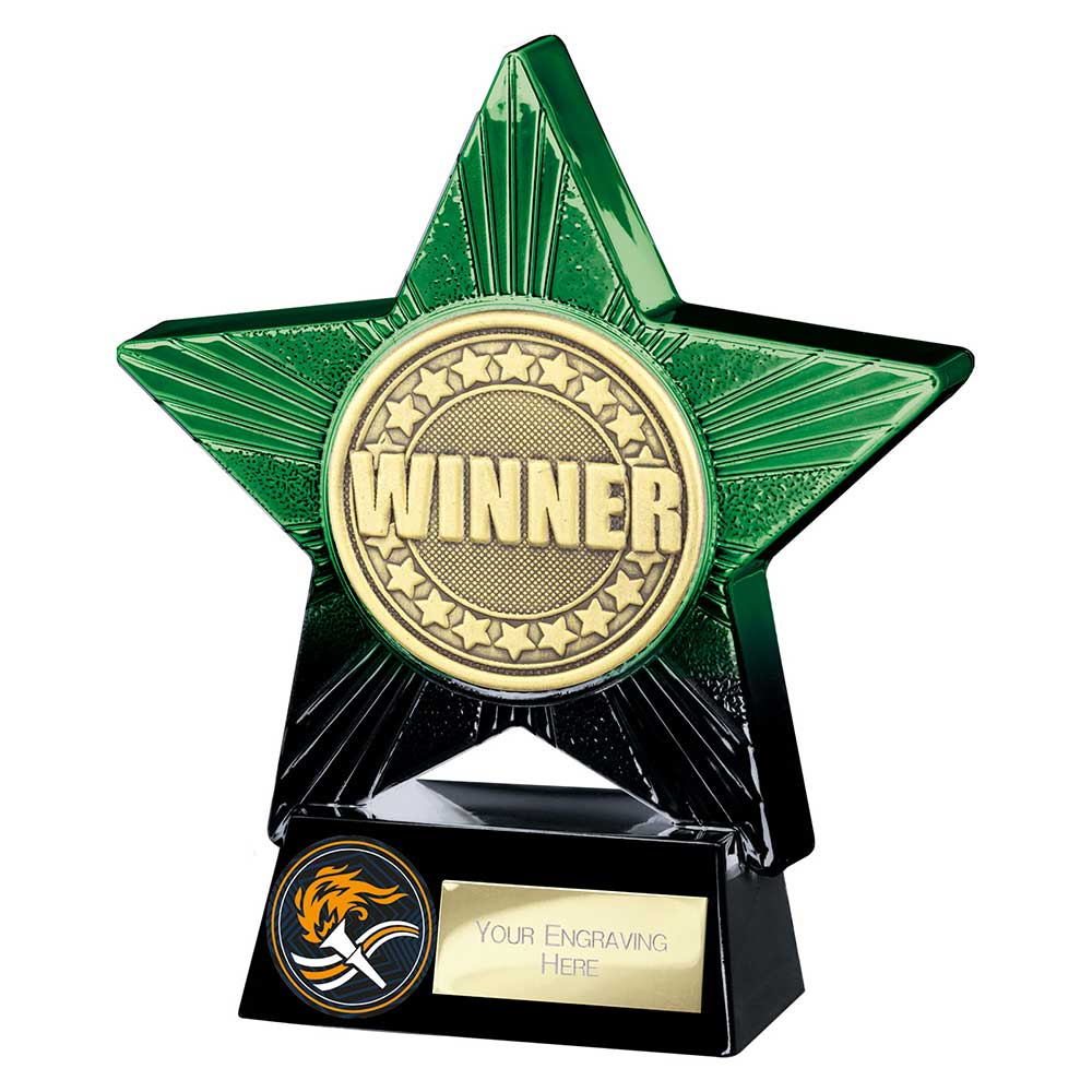 Green Superstar Winner Trophy 140mm highFeatures wording set within green and black star on a wedged gold standEngraving plate and badge can be applied to front