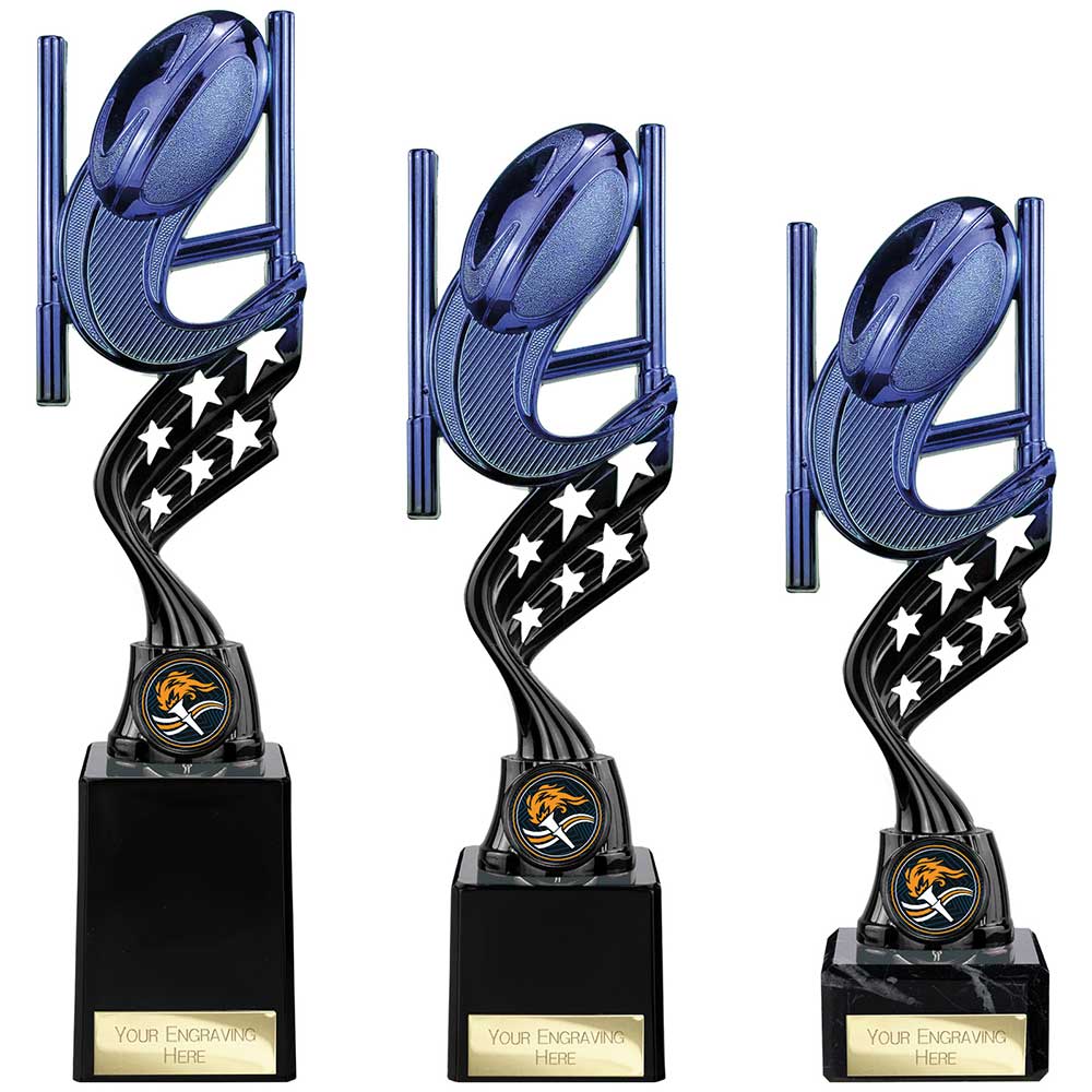 Innov8 Blue Rugby Trophy 230mm highFeatures blue ball and posts on black plastic stand with star detailSits on a square black baseEngraving plate and team badge can be applied to front