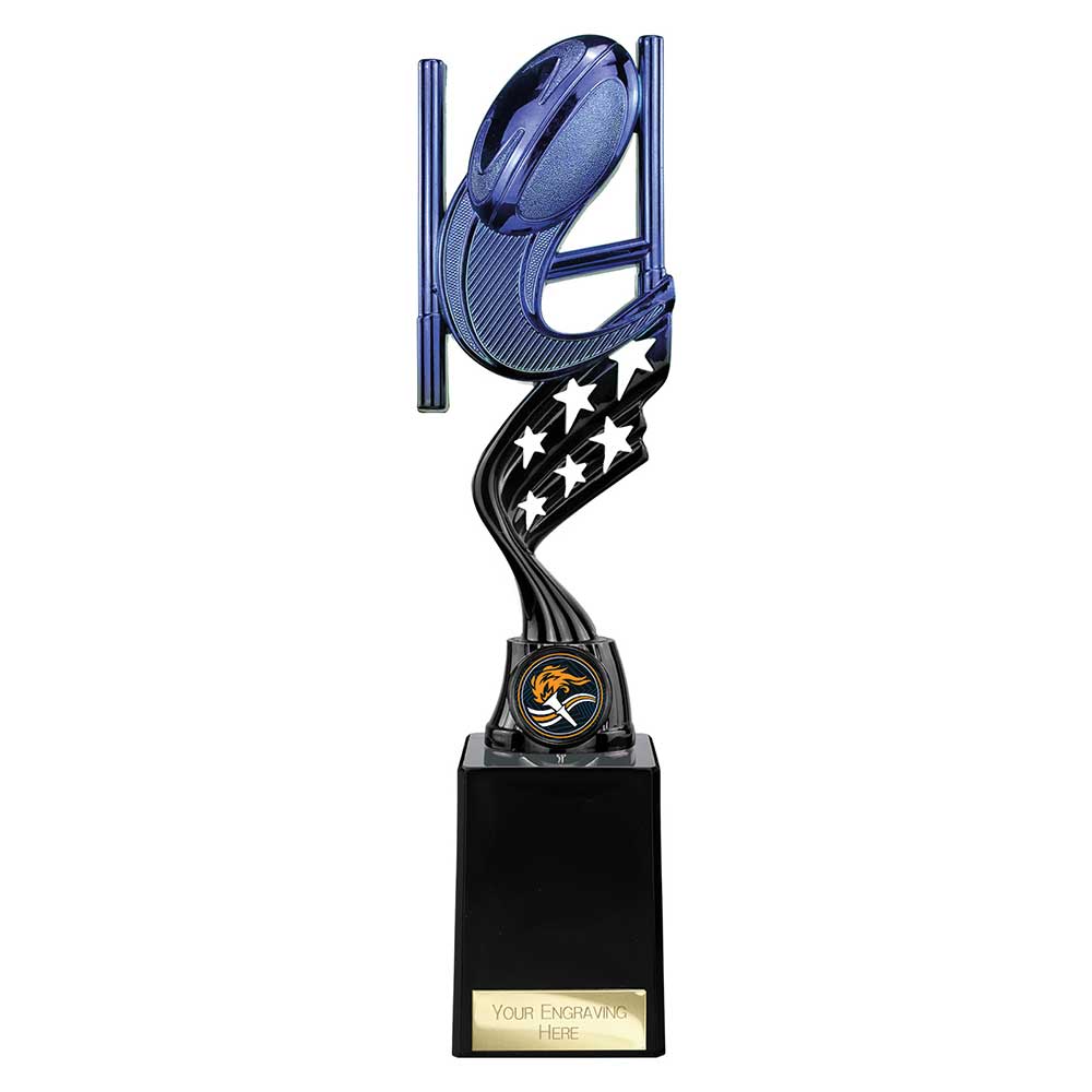 Innov8 Blue Rugby Trophy 275mm highFeatures blue ball and posts on black plastic stand with star detailSits on a square black baseEngraving plate and team badge can be applied to front