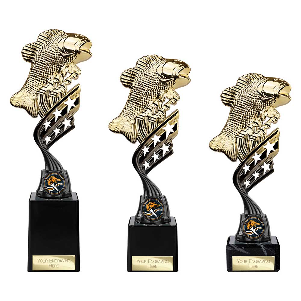 Innov8 Gold CarpTrophy 225mm highFeatures detailed gold carp on black plastic stand with star detailSits on a square black baseEngraving plate and badge can be applied to front