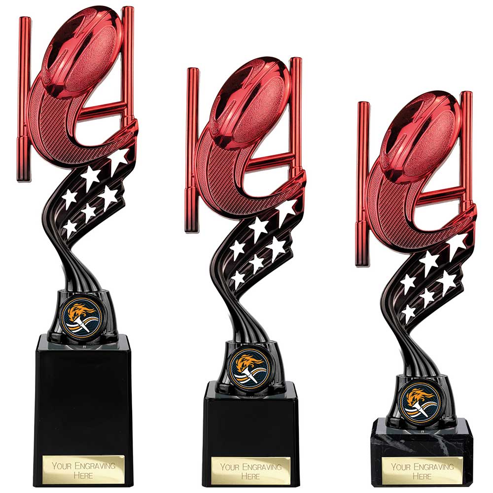 Innov8 Red Rugby Trophy 250mm highFeatures red ball and posts on black plastic stand with star detailSits on a square black baseEngraving plate and team badge can be applied to front