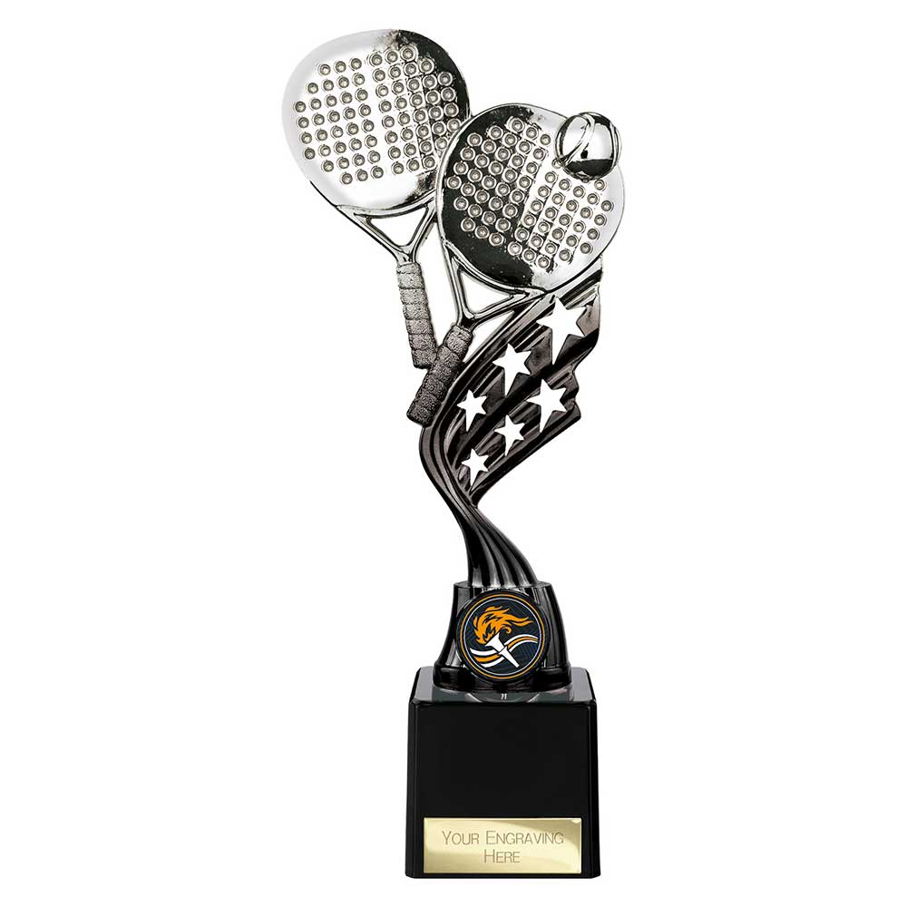 Innov8 Silver Padel Trophy 230mm highFeatures silver rackets and ball on black plastic stand with star detailSits on a square black baseEngraving plate and ckub badge can be applied to front