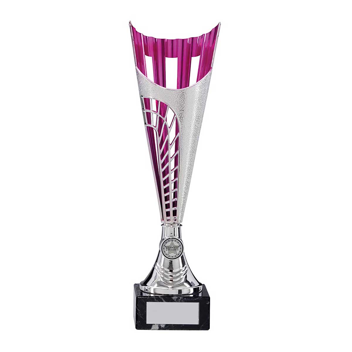 Pink and silver Garrison Cup Trophy 350mm high Detailed plastic laser cut design on a black stone base Engraving plate and club badge can be applied to the front