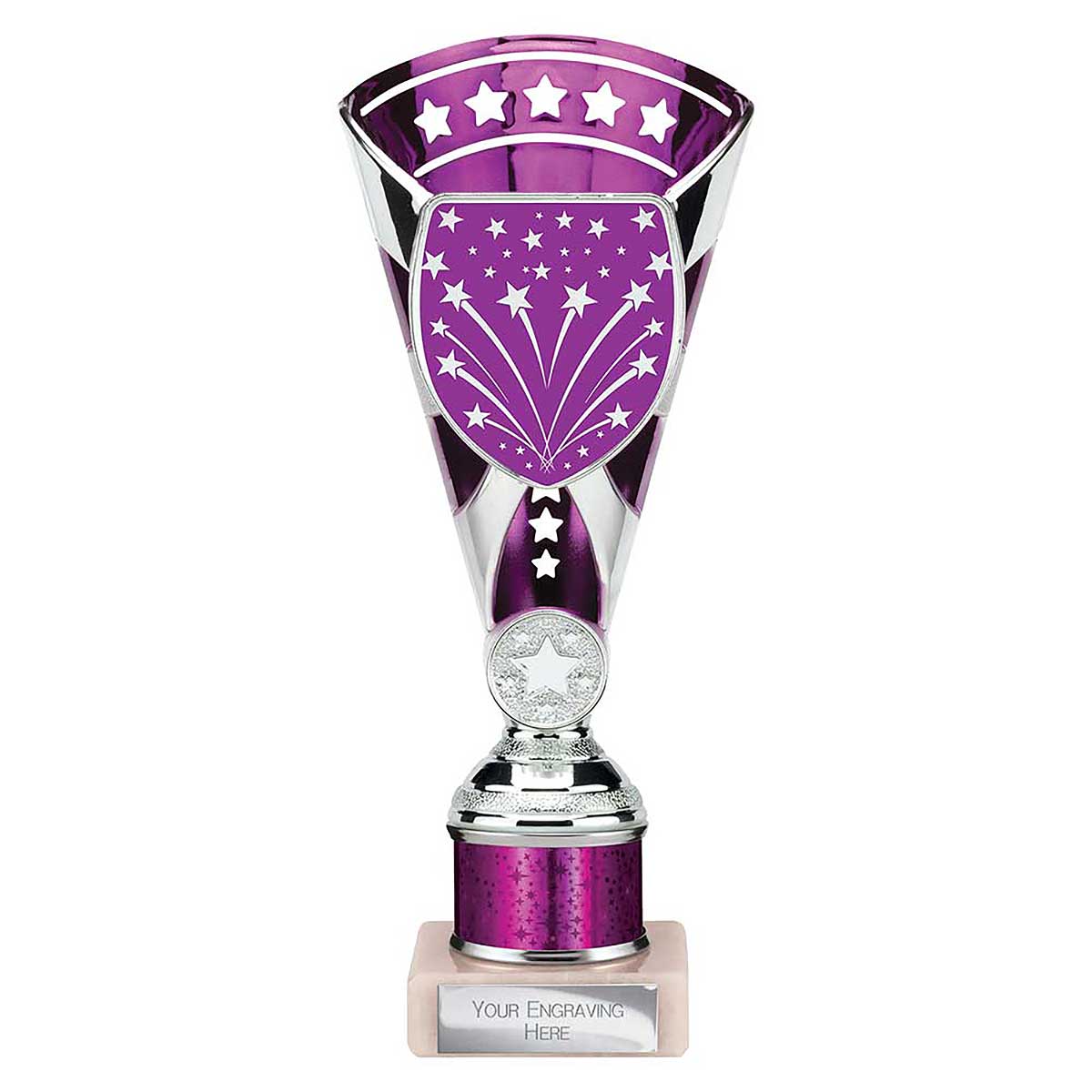 Purple Silver Cobra Cup Trophy 230mm Star design sticker on the front of the cup with sparkly column and stone base A custom sticker, engraving plate and club badge can be applied to the front