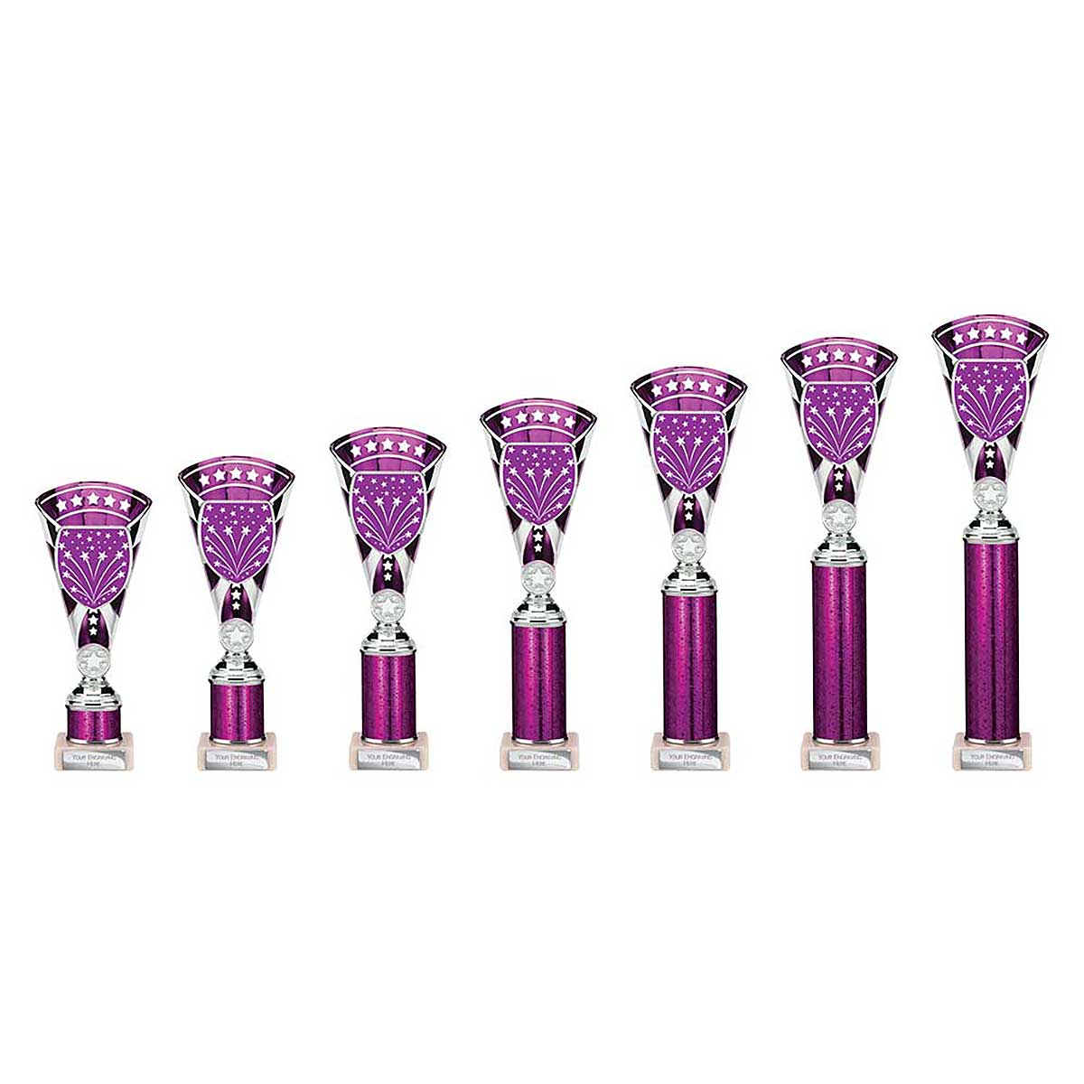 Purple Silver Cobra Cup Trophy 255mm Star design sticker on the front of the cup with sparkly column and stone base A custom sticker, engraving plate and club badge can be applied to the front