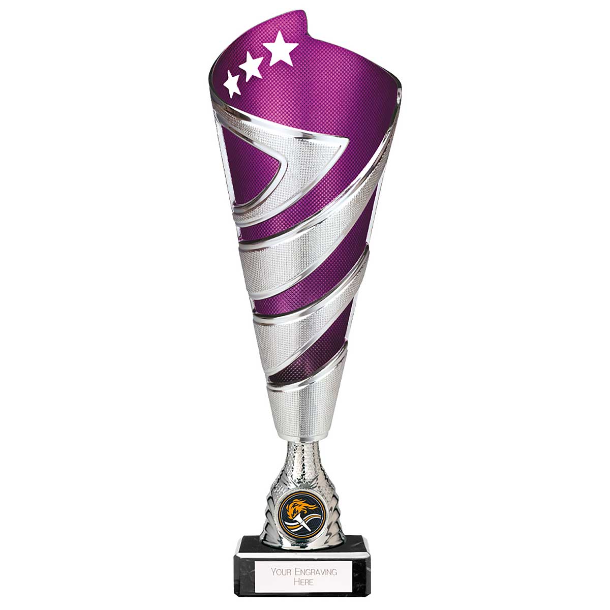 Purple Hurricane Altitude Multisport Trophy 295mm high Textured plastic design on a silver riser and black stone base Engraving plate and club badge can be applied to the front