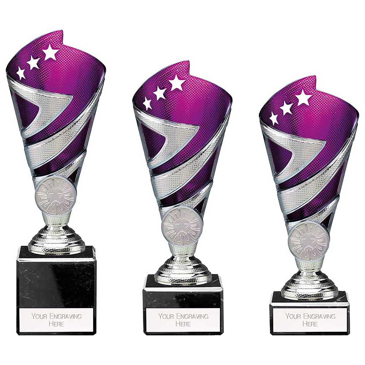 Purple and silver Hurricane Multisport Trophy 170mm high Textured plastic design on a heavy black stone base Engraving plate and club badge can be applied to the front