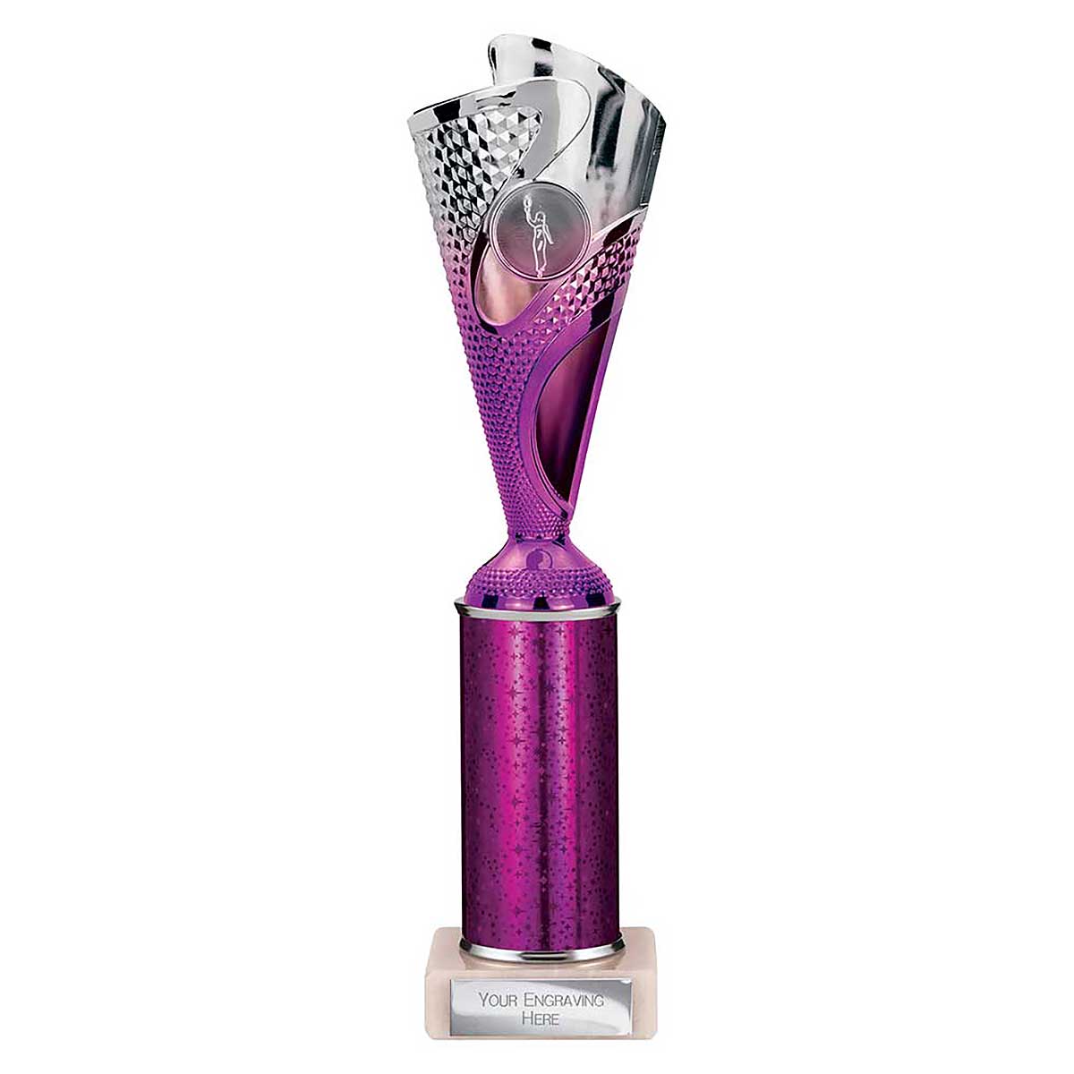 Purple Silver Rodeo Multsport Award 290mm high Modern design plastic flute on a sparkly column and stone base Engraving plate and club badge can be applied to the front
