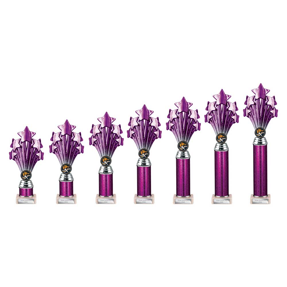 Purple 5 Star Trophy 340mm highPurple glitter superstar column on a stone baseEngraving plate and club badge can be applied to the front