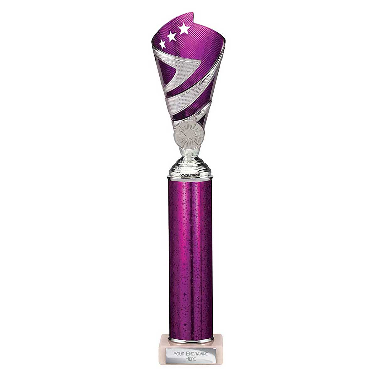 Purple Super Hurricane Multisport Trophy 350mm high Textured plastic design on a glitter column and stone base Engraving plate and club badge can be applied to the front