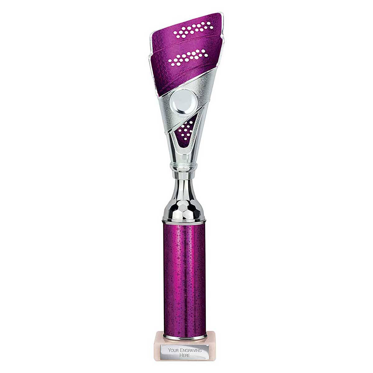 Purple and silver Predator multisport trophy 360mm high Detailed plastic cone design with glitter column & stone base Engraving plate and club badge can be applied to the front