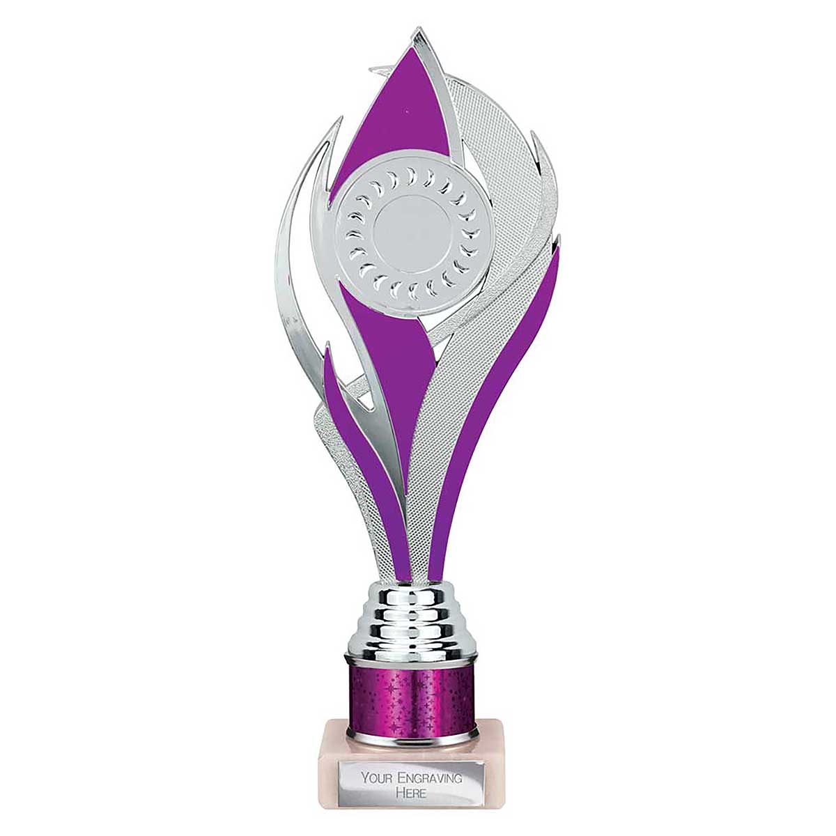 Purple and silver Super Volcano Trophy 260mm high Moulded plastic design on a superstar glitter column and stone base Engraving plate and club badge can be applied to the front